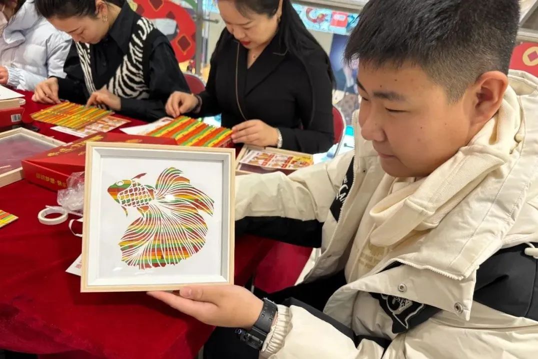 活动现场,参与者们在工作人员的指导下,纷纷动手制作精美的手工艺品。纸艺金鱼色彩斑斓、栩栩如生;龙年挂件寓意吉祥、幸福美满,每一件作品都蕴含着参与者们的巧思与匠心。