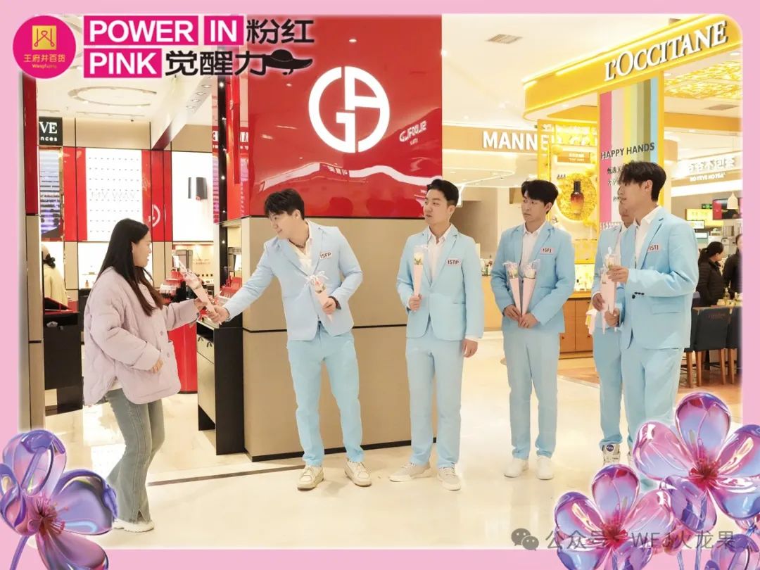 西安永宁门店特别策划“粉红觉醒力”主题活动,16位不同MBTI的帅气男生手捧鲜花,邀现场顾客共赴花漾巡游。接过鲜花的张女士瞬间笑靥如花,捧着鲜花反复端详:“太惊喜了!谢谢你们。”几位结伴而来的年轻女孩更是兴奋的举起手机,拿着鲜花与骑士团合影留念。