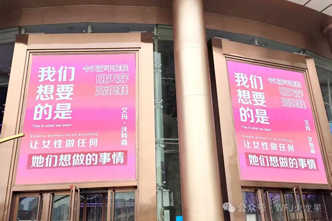 洛阳店在商场正门通过大屏喊话的形式,祝所有女性朋友们节日快乐。“让女性做任何她们想做的事情”“我生来就是高山而非溪流”“祝你三八妇女节快乐”等内容,循环在大屏播放,摒弃了“女王”“女神”等字样,为女性发声。