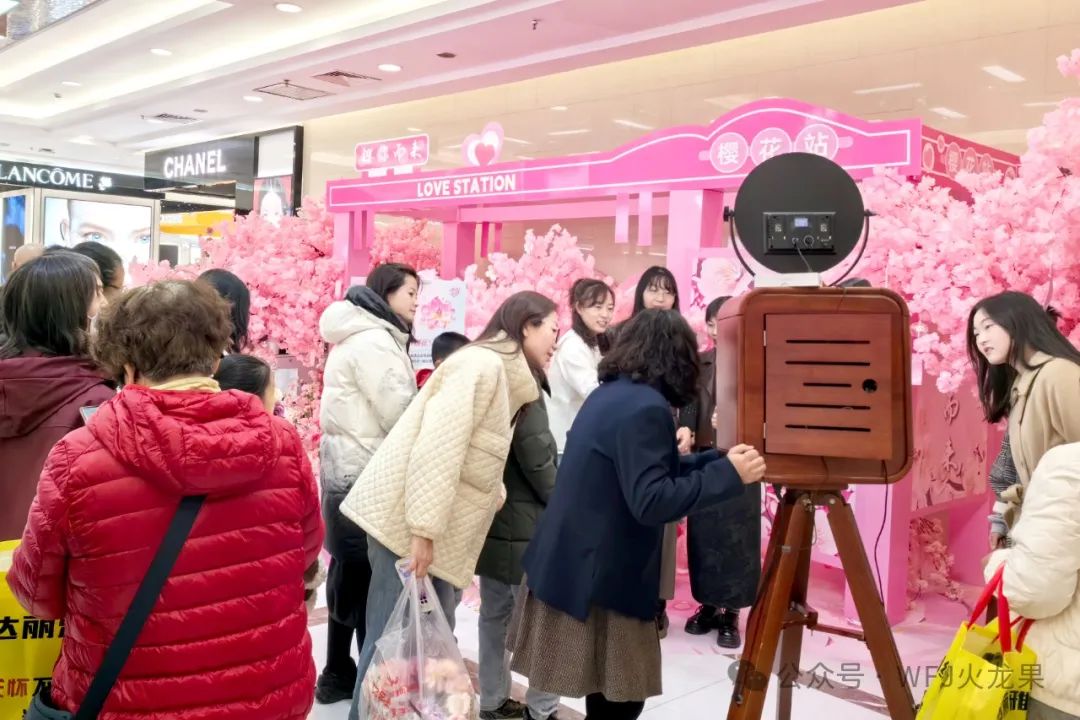 包头昆区店以樱花元素装饰,营造出了浓厚的春日氛围,特别策划的“樱花写真”更成为了全场亮点。一台复古相机被精心布置在店内显眼位置,邀请女性顾客前来免费拍摄。镜头前,顾客们脸上洋溢着幸福的笑容,摆出各种优雅造型,尽情享受这一份专属的浪漫与美好。