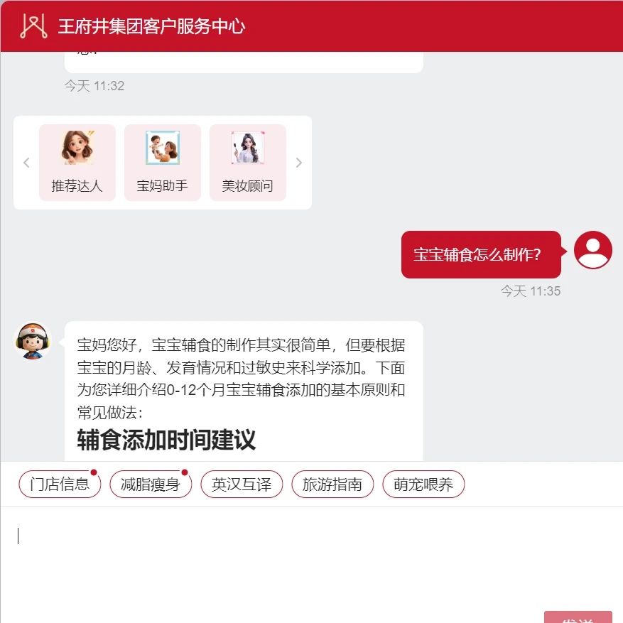 专为育儿家庭打造,采用亲切细致的沟通风格,聚焦婴幼儿用品、亲子活动、母婴室位置等问题。如:当宝妈询问 “宝宝辅食怎么制作” 时,智能体不仅会给出科学的辅食添加原则,还会提供具体的制作建议。