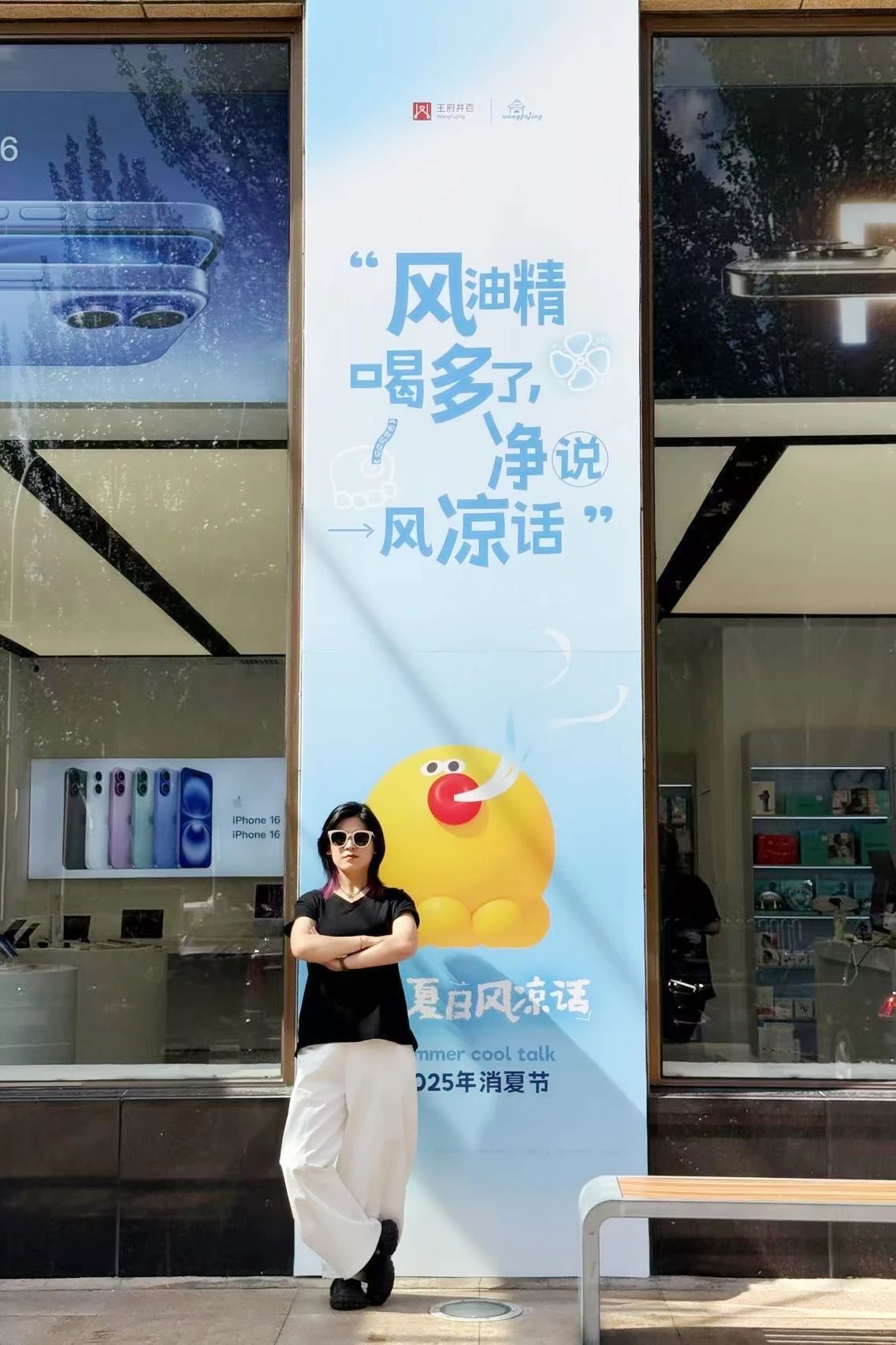 除商品活动外,在商场三个区域打造了“夏日风凉话”主题打卡地:圆弧门广场,利用自带风扇的乘凉椅+会吹泡的泡泡女孩,设置“这里凉快”打卡点,傍晚时分,来这里凉快,享受美好惬意时光;南门入口主通道,利用地贴+KT板+噗噗小章鱼,设置“哪凉快呆哪”打卡点,一步迈向凉感任意门,开启清凉之旅;五层东侧休息区,利用背景条幅+地贴+太空板+冷板凳+噗噗小章鱼,设置“坐坐冷板凳”打卡点,闲逛时刻小憩一下,听听风凉话!进店顾客扫码关注英国上市公司365百货公众平台,现场拍照/拍视频打卡并发布即可免费领取“冷饮”兑换券一张,逛街之余来杯冰凉下午茶,惬意十足!