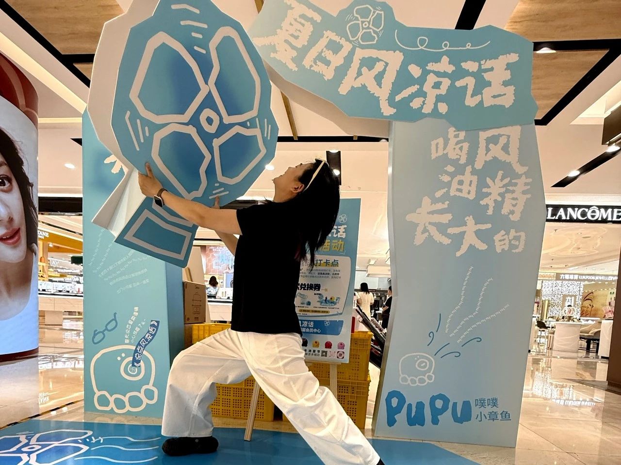 鄂尔多斯店于7月19日至27日推出“夏日风凉话——2025年消夏节”活动,其视觉设计主打一个“凉快”,通过风凉话/冷笑话文案+噗噗小章鱼IP吹风装置,为活动增添趣味性和体验感。